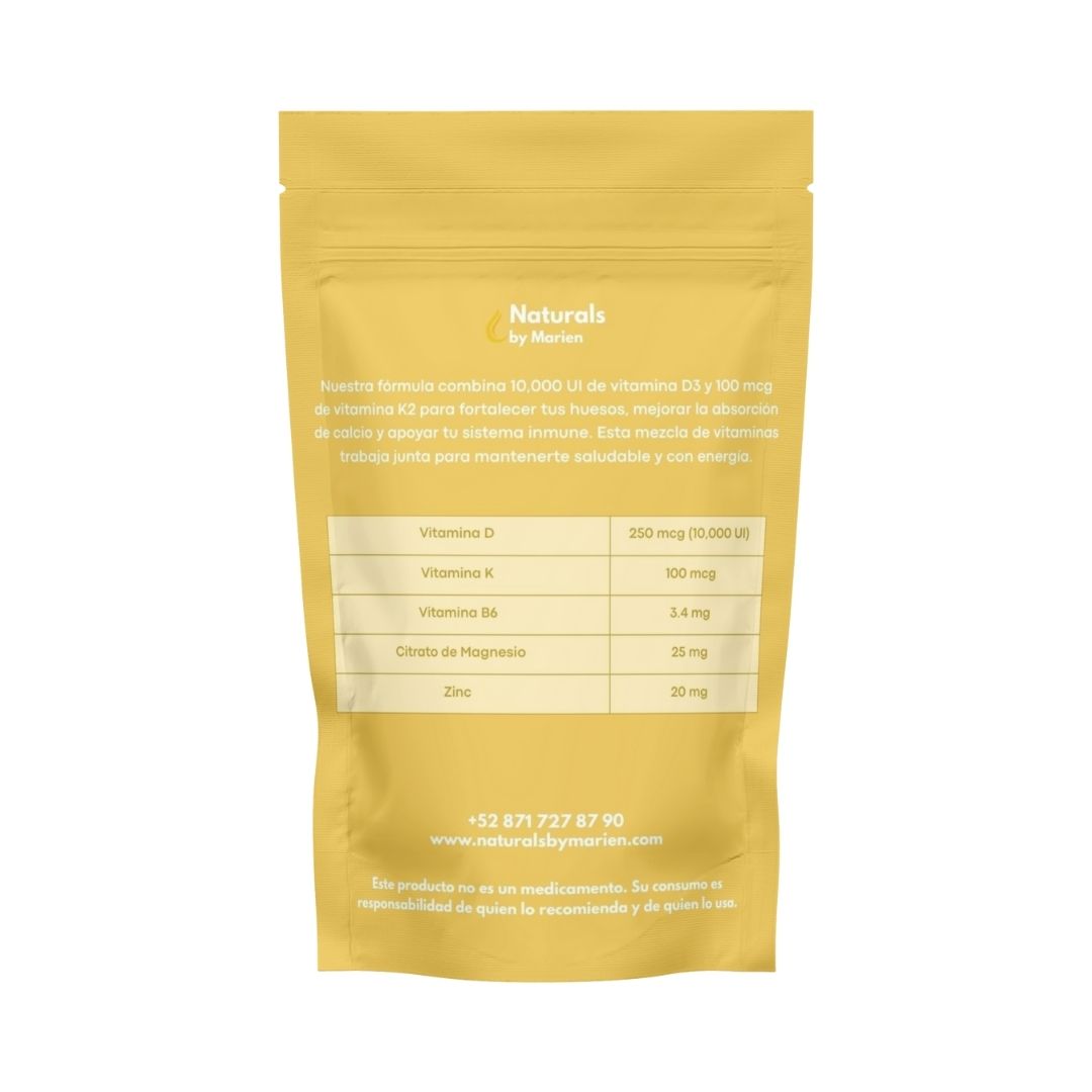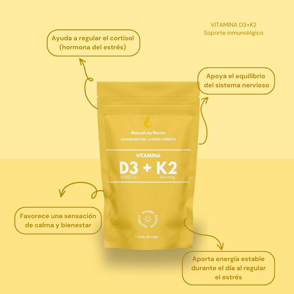 Vitamina D3 con K2 es un suplemento que potencia la absorción del calcio y lo dirige a huesos y dientes, ayudando a mantenerlos fuertes y al mismo tiempo protegiendo arterias y corazón.